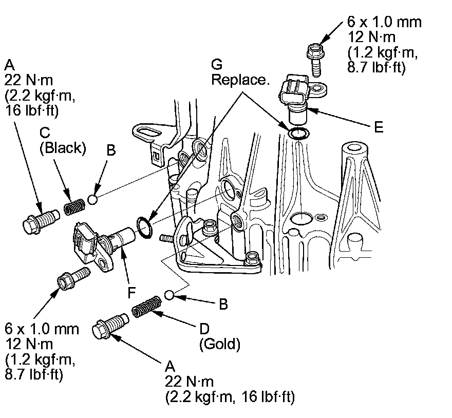 27. Install the input shaft (mainshaft) speed sensor (E), the output shaft (countershaft) speed sensor (F), and new O-rings (G).