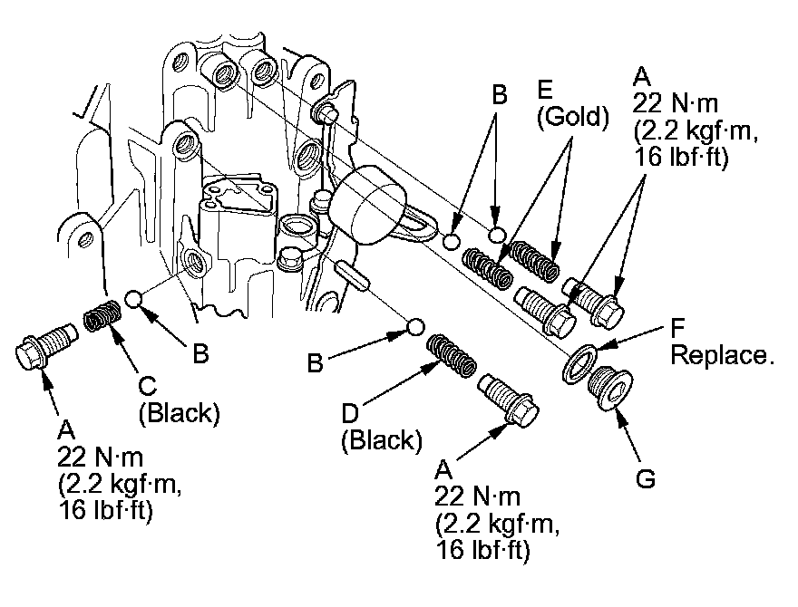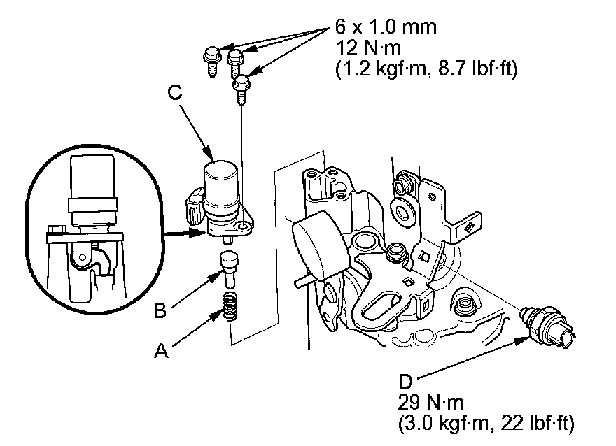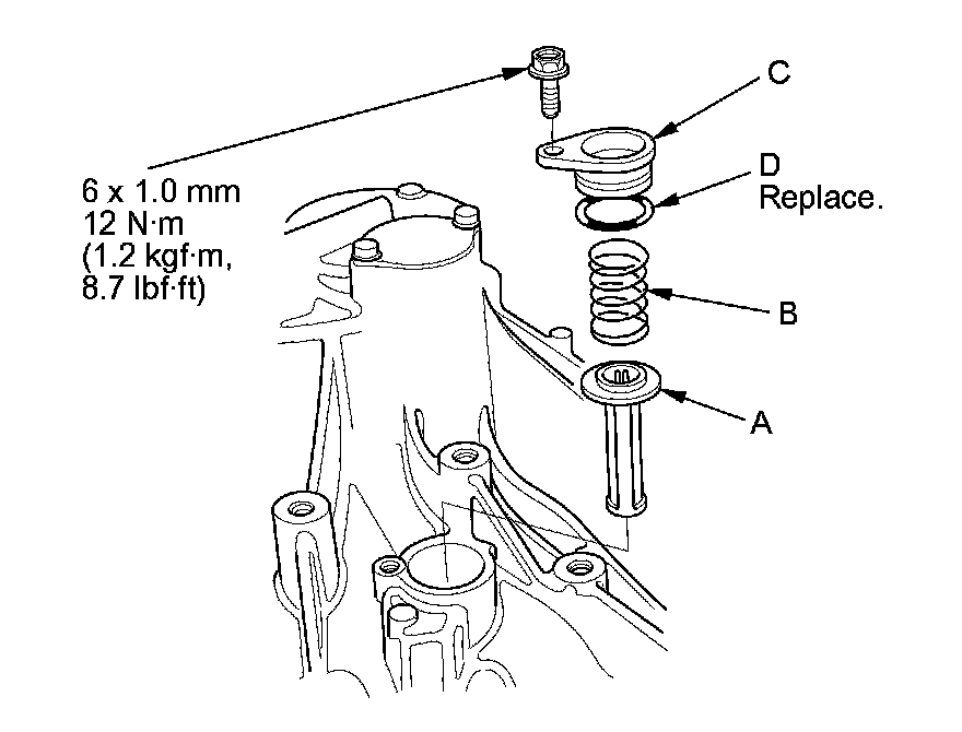 34. Install the oil pump strainer (A), the strainer set spring (B), and the strainer cover (C) with a new O-ring (D).