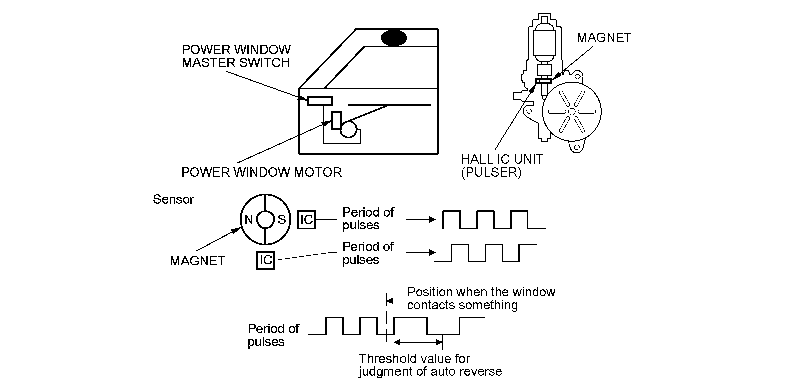 The driver's and front passenger's power window motors incorporate a Hall IC unit (pulser) which generates pulses during the motor's operation and sends pulses to the driver's and passenger's power window control units. As soon as the power window control units detect a change in the pulse frequency from the Hall IC unit (pulser), the power window control units make the power window motor stop and reverse. This prevents pinching your hand or fingers during auto-up operation. The auto reverse function dose not work when the power window master switch is held in the close position.
