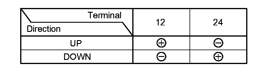 2. Test the motor in each direction by connecting battery power and ground to the front passenger's power window switch 37P connector (A) according to the table.
