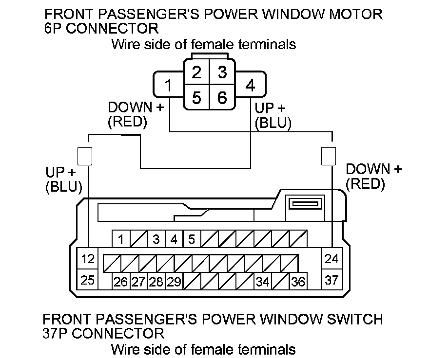 6. Check for continuity between the front passenger's power window switch 37P connector terminals and front passenger's power window motor 6P connector terminals as shown. There should be continuity.