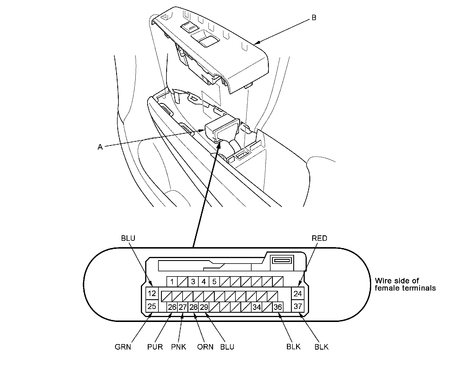 2. Disconnect the 37P connector (A) from the front passenger's power window switch (B).
