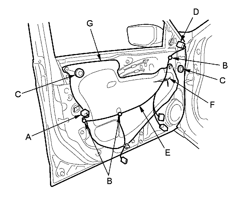 3. Disconnect the power door lock actuator connector (A), and detach the harness clips (B). Remove the plug caps (C). 4-door: Disconnect the power mirror connector (D).