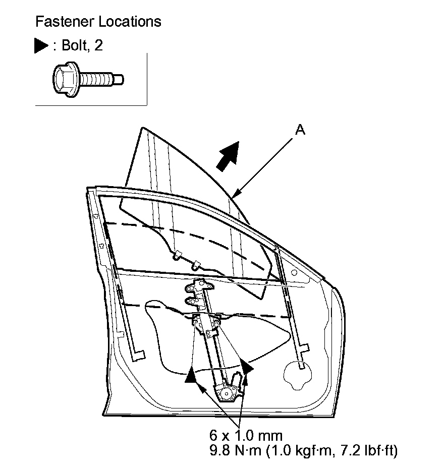 6. Lower the glass (A) until you can see the bolts, then remove them. Carefully pull the glass out through the window slot. Take care not to drop the glass inside the door.