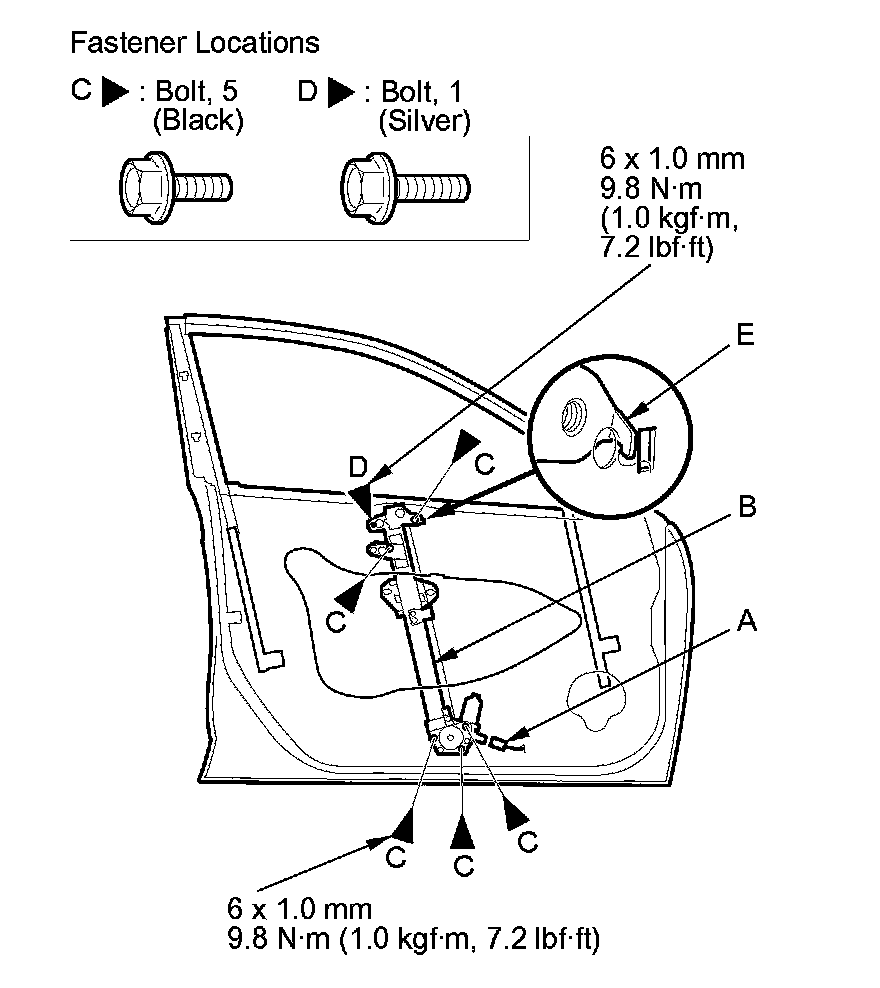 8. Remove the bolts (C), and loosen the bolts (D). Release the hook (E), then remove the regulator through the hole in the door.