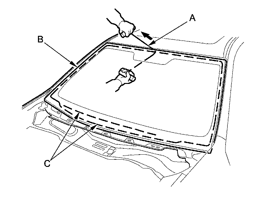 6. With a helper on the outside, pull the piano wire (A) back and forth in a sawing motion. Hold the piano wire as close to the windshield (B) as possible to prevent damage to the body and the dashboard. Carefully cut through the rubber dam and the adhesive (C) around the entire windshield.