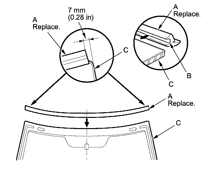 14. Attach the windshield molding (A) with adhesive tape (B) to the upper edge of the windshield (C). Be careful not to touch the windshield where the adhesive will be applied.