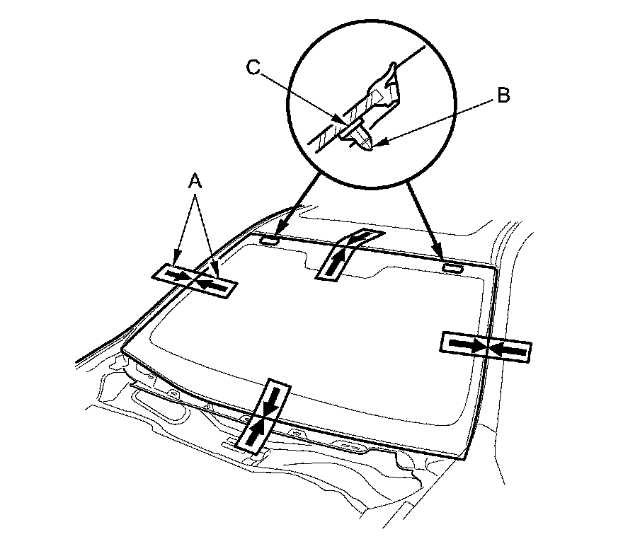 16. If you are installing a new windshield, set the windshield in the opening, and center it. Make alignment marks (A) across the windshield and the body with a grease pencil at the four points shown. Make sure the pins (B) of both upper clips (C) contact with the edge of the body holes. Be careful not to touch the windshield where the adhesive will be applied.