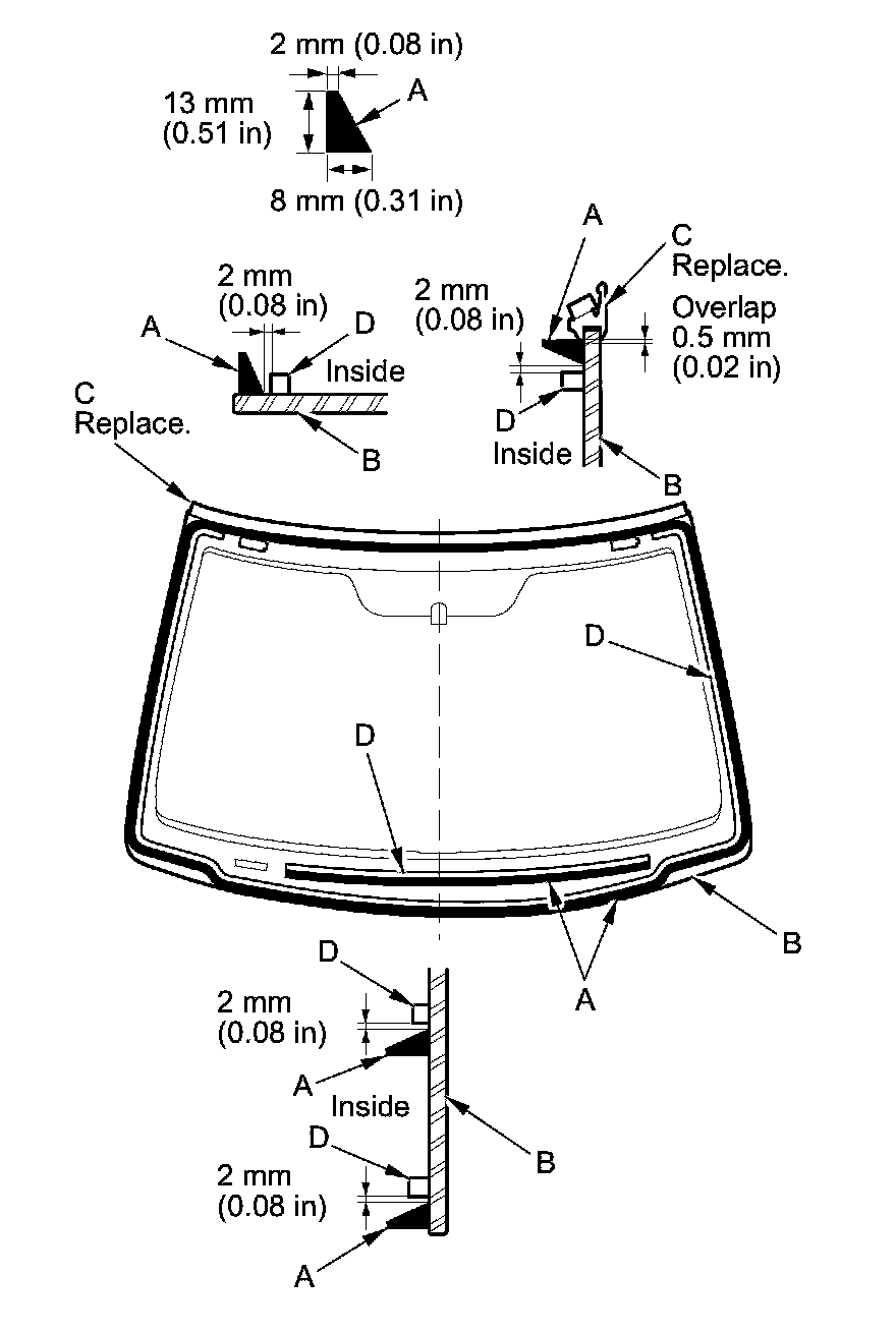 21. Put the cartridge in a caulking gun, and run a continuous bead of the adhesive (A) around the windshield (B) along the edge of the windshield molding (C) and the rubber dams (D) as shown. Apply adhesive within 30 minutes after applying the glass primer. Make a slightly thicker bead at each corner.