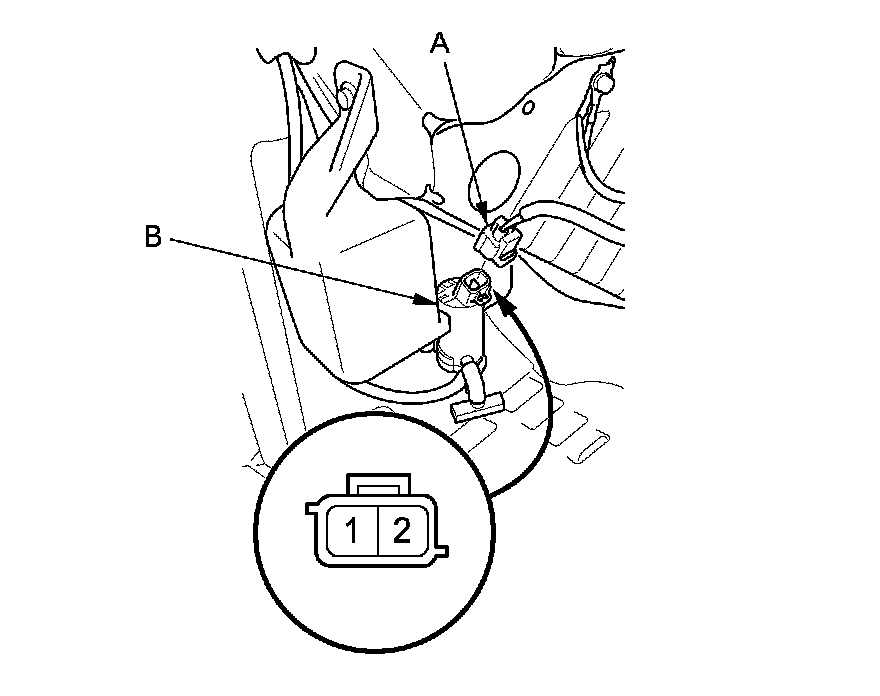 2. Disconnect the 2P connector (A) from the windshield washer motor (B).