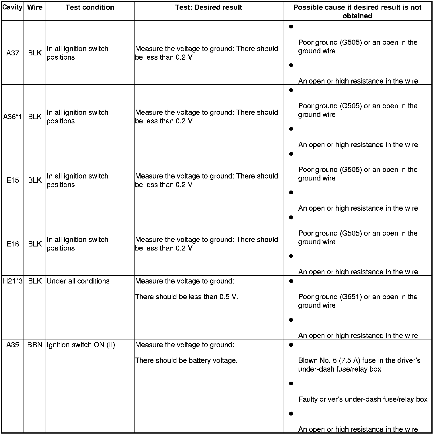 9. Reconnect the connectors to the passenger's under-dash fuse/relay box, and do these input tests at the following connectors.