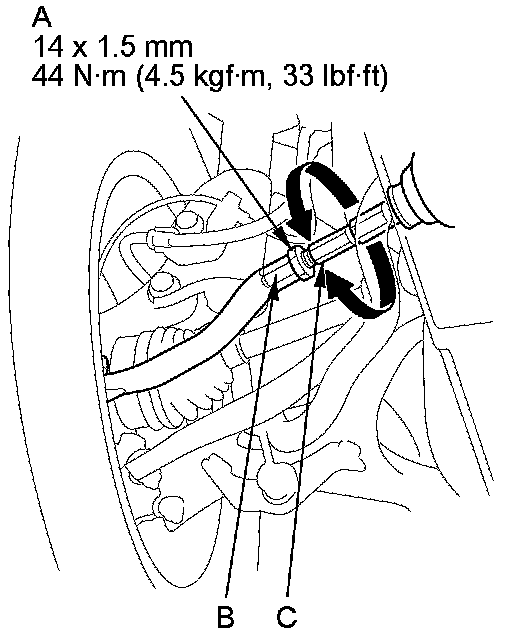 3. Hold the adjusting bolt (A) on the trailing arm (B), and loosen the self-locking nut (C).