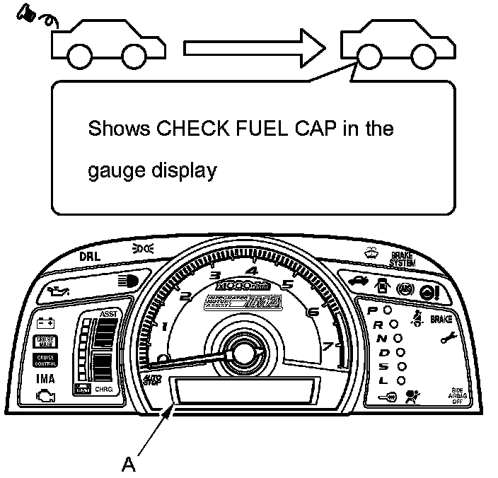 The first time a leak is detected a CHECK FUEL CAP message appears in the gauge display (A). To scroll to another message, press the select/reset button. The CHECK FUEL CAP message appears each time you restart the engine until the system turns the message off. Turn the engine off then replace or tighten the fuel fill cap until it clicks at least once.