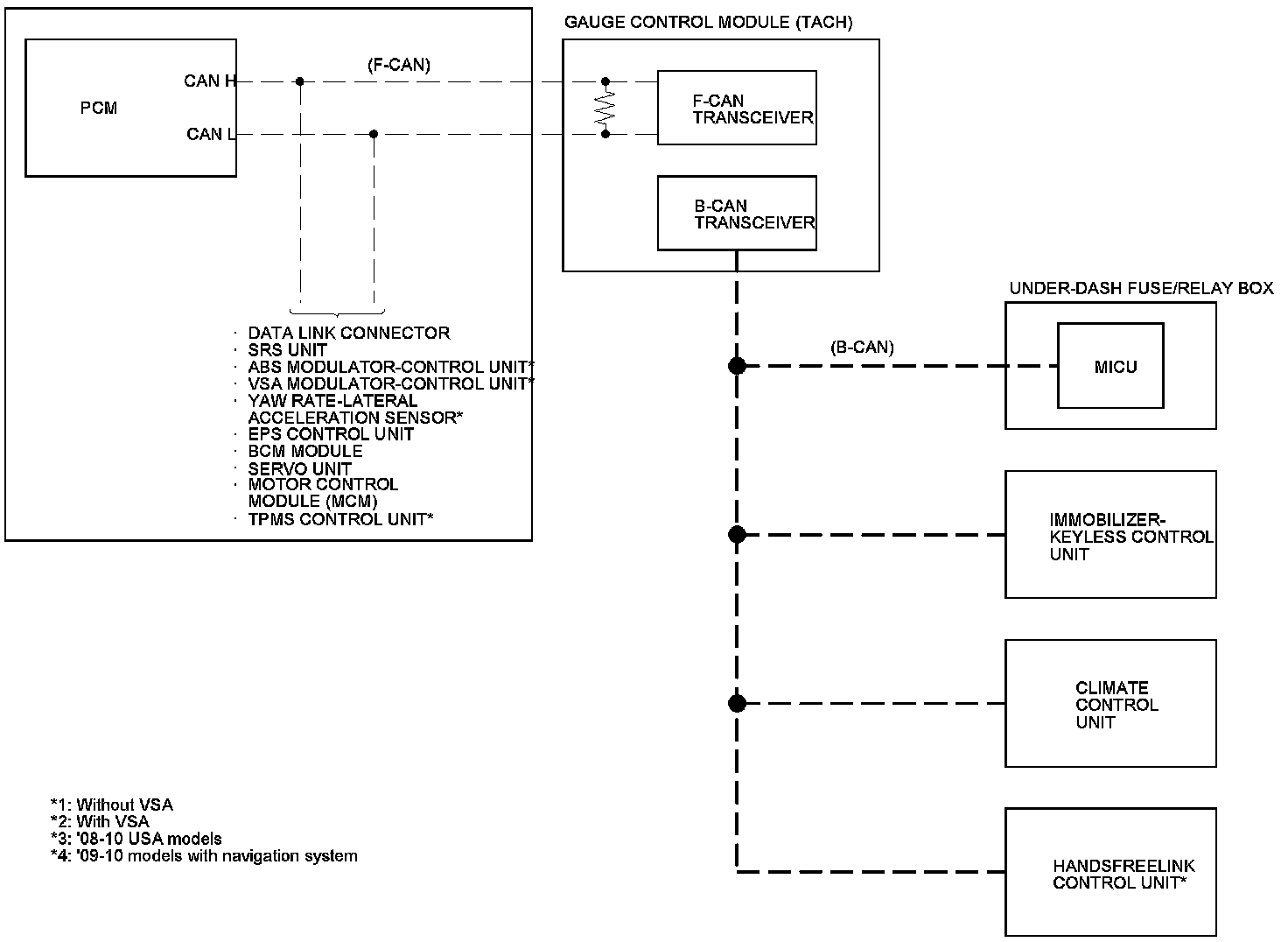 The gauge control module (tach) acts as a gateway to allow both systems to share information, the gauge control module translates information from B-CAN to F-CAN and from F-CAN to B-CAN.