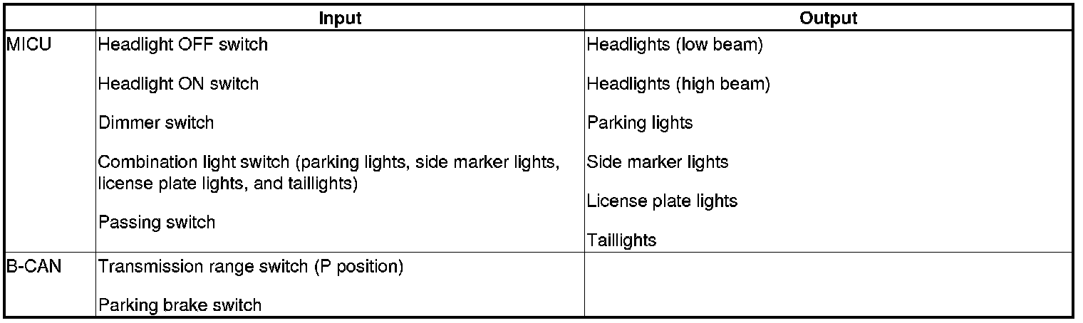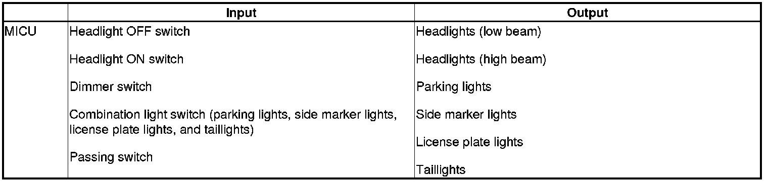 The MICU contains the relay circuits for the headlight high/low beams and taillights, and controls the lighting system ON/OFF based on inputs from the combination light switch.