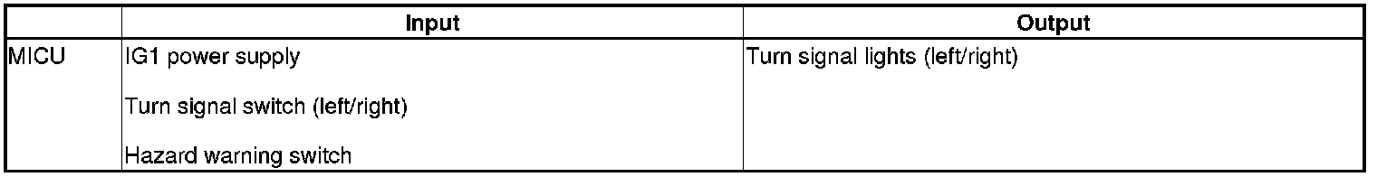 The MICU control of the turn signal/hazard warning lights is based on inputs from the turn signal switch and hazard warning switch.