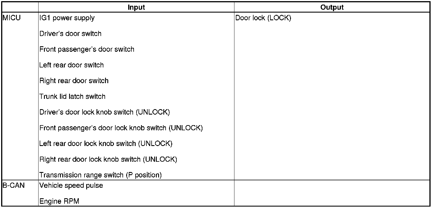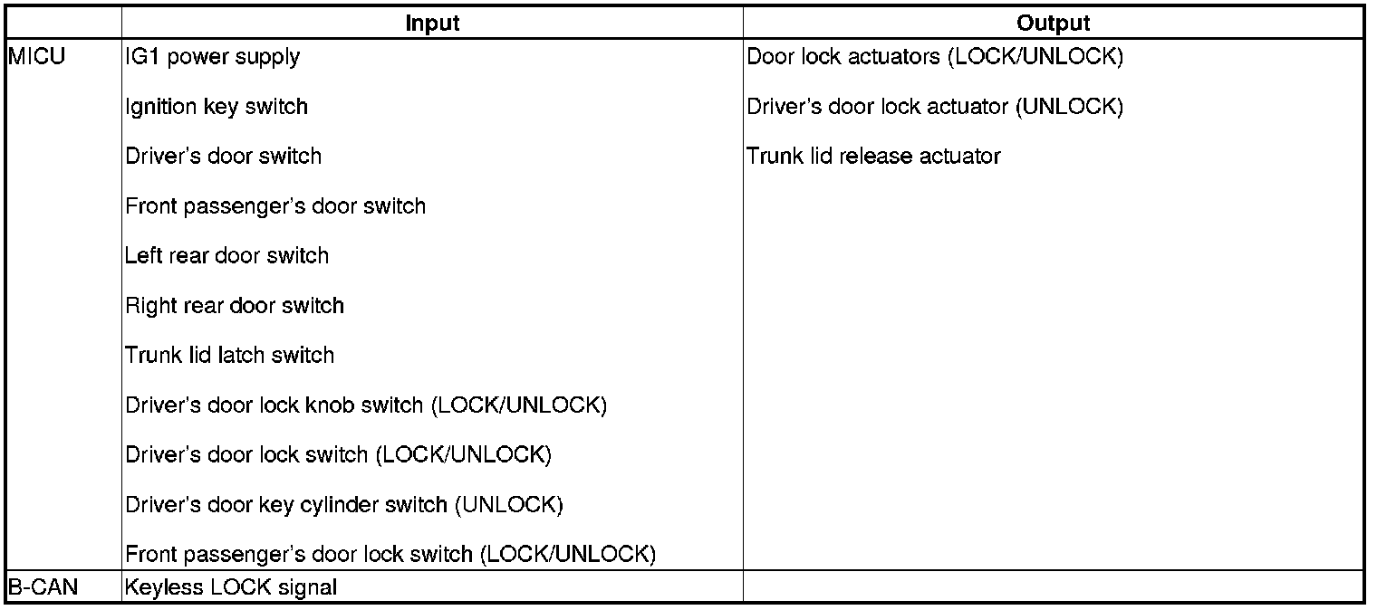 The MICU control of the door lock actuators is based on inputs from each switch and B-CAN data.