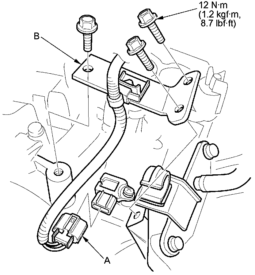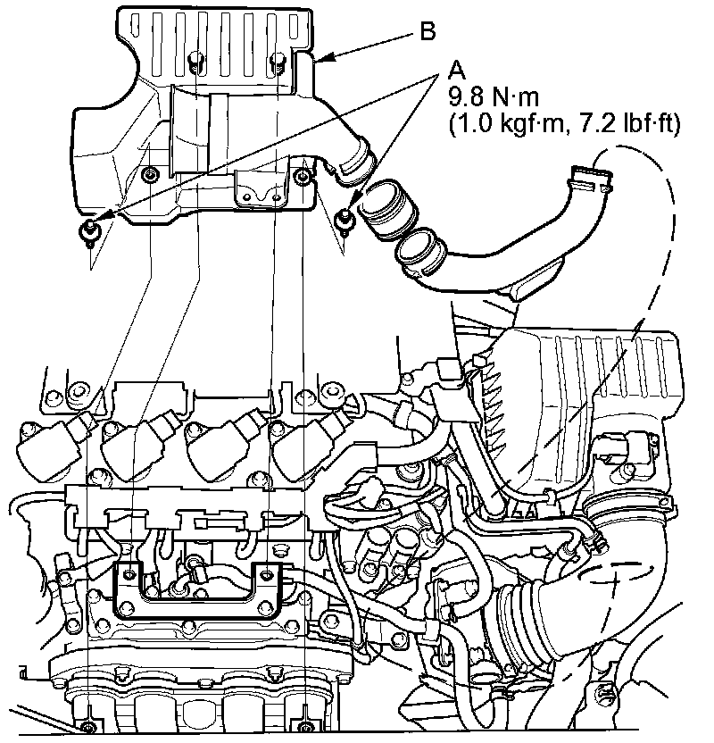 1. Remove the intake air resonator mounting bolts (A), then remove the intake air resonator (B).