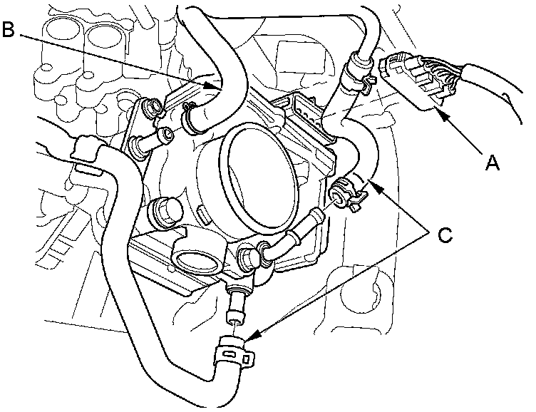 4. Disconnect the throttle body connector (A), the EVAP hose (B), and the two coolant bypass hoses (C) from the throttle body. Plug the lines to prevent coolant from leaking out.