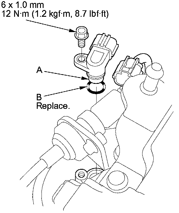 3. Install a new O-ring (B) on a new vehicle speed sensor, then install the vehicle speed sensor in the transmission housing.