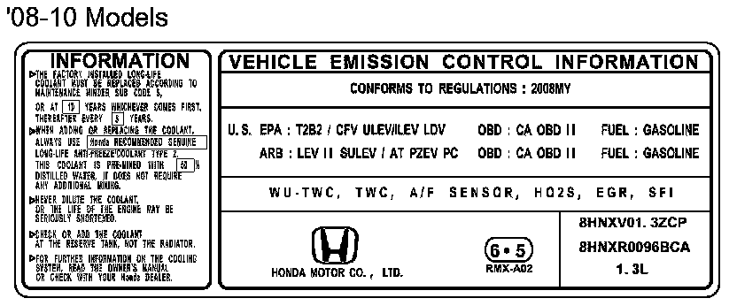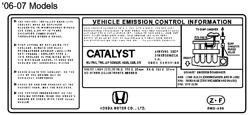 THIS VEHICLE CONFORMS TO U.S. EPA TIER 2 BIN 2 AND CFV ULEV REGULATIONS APPLICABLE TO 2006 MODEL YEAR NEW PASSENGER CARS AND CALIFORNIA REGULATIONS APPLICABLE TO 2006 MODEL YEAR NEW LEV II SULEV PASSENGER CARS. THIS VEHICLE HAS ALSO BEEN CERTIFIED AS AN AT-PZEV BY CALIFORNIA AIR RESOURCES BOARD. EPA CERTIFICATION TEST FUEL FOR CFV: EPA UNLEADED GASOLINE.