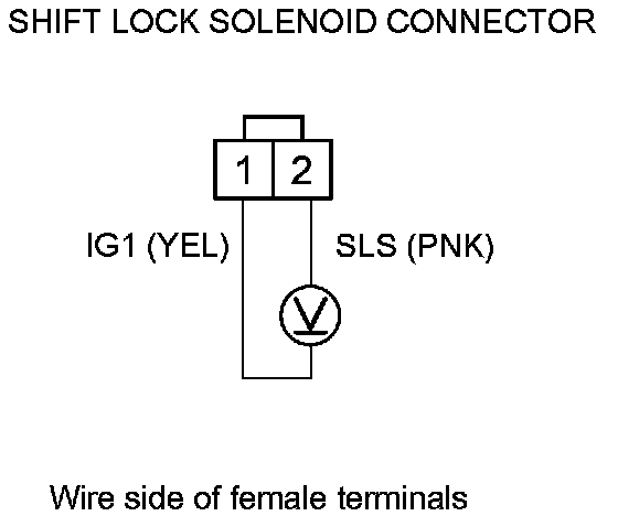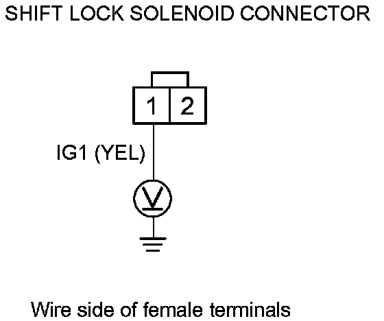 11. Release the brake pedal, and measure the voltage between shift lock solenoid connector terminals No. 1 and No. 2. The shift lever must be in P.