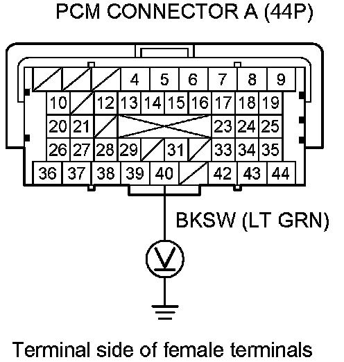 20. Measure the voltage between PCM connector terminal A40 and body ground while pressing the brake pedal and when the brake pedal is released.