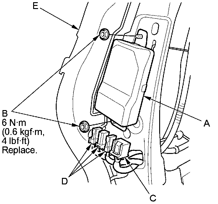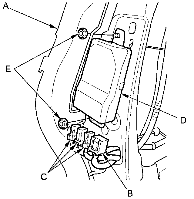 1. Place the ODS unit (A) on the seat-back frame. Tighten the two nuts (B), and connect the ODS unit 18P connector (C) and OPDS sensor connectors (D) to the ODS unit.