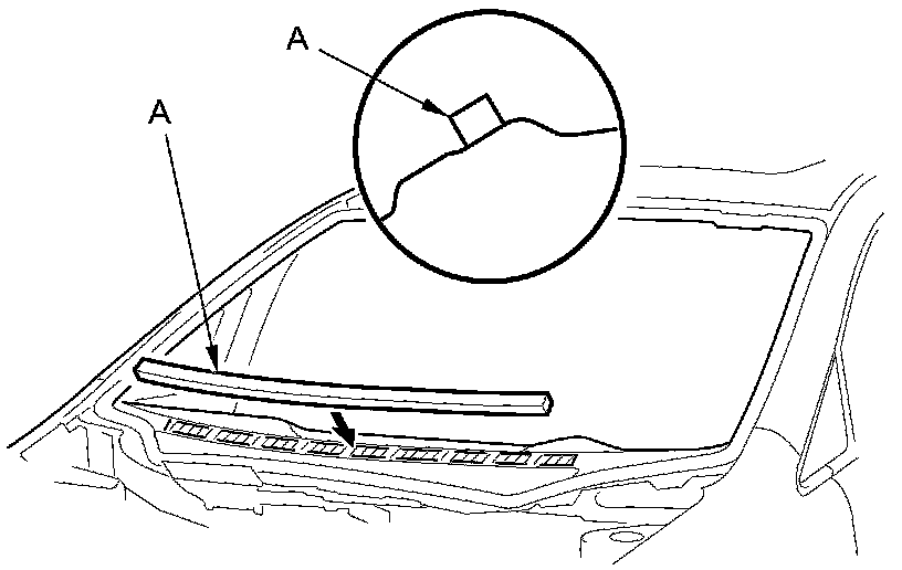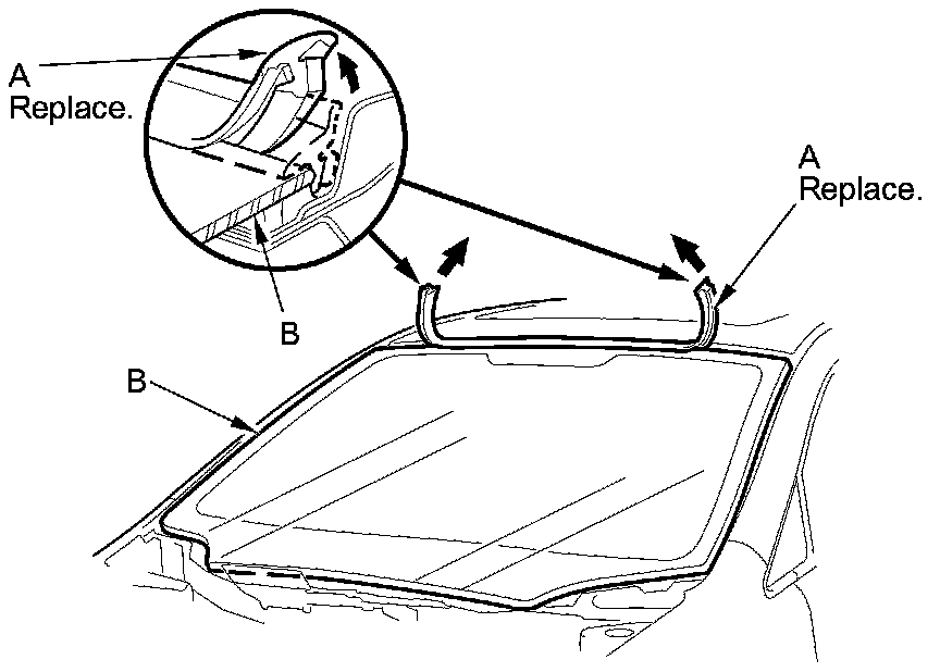 2. Remove the windshield molding (A) from the upper edge of the windshield (B). If necessary, cut the windshield molding with a utility knife.