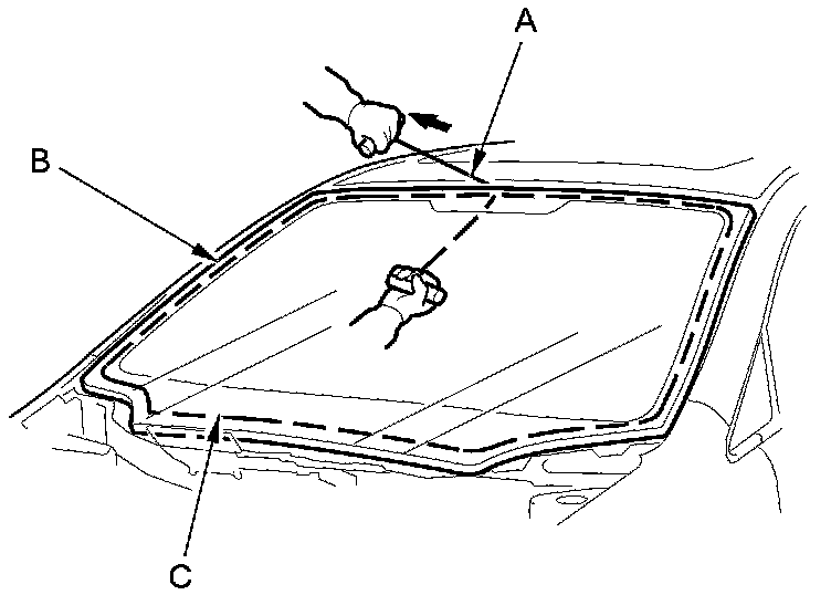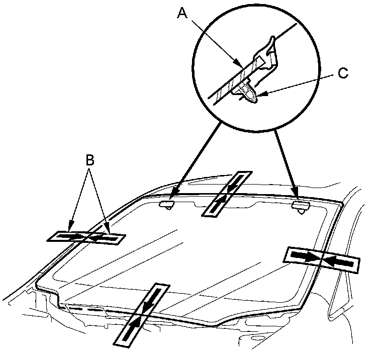 12. Attach the windshield molding (A) with adhesive tape (B) to the upper edge of the windshield (C). Be careful not to touch the windshield where the adhesive will be applied.