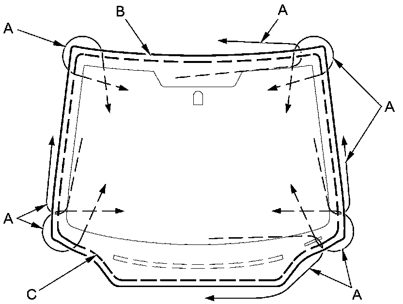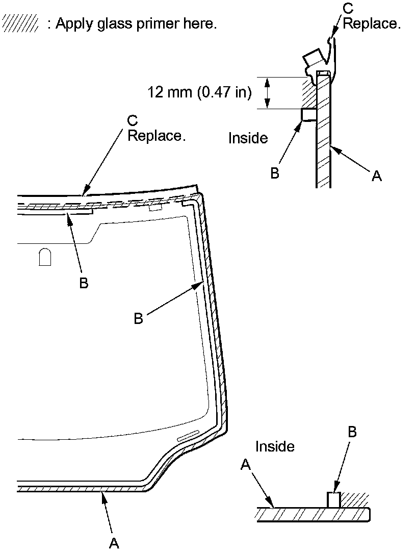 17. Apply a light coat of glass primer along the edge of the windshield (A) between the rubber dams (B) or the windshield molding (C) as shown, then lightly wipe it off with gauze or cheesecloth: