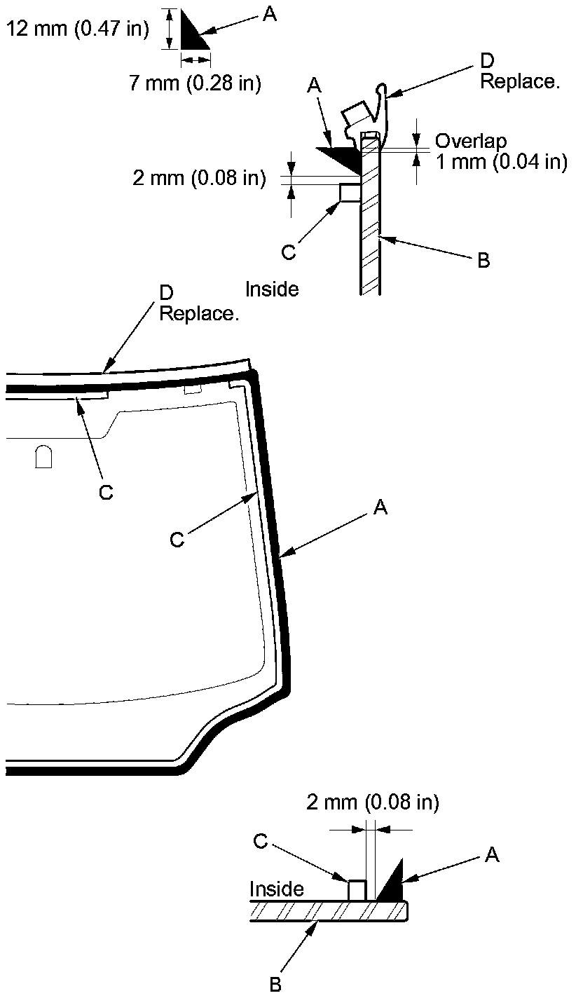 11. Apply glass primer to the upper clips mounting areas on the windshield (A), and let it dry. Remove the adhesive backing and attach the upper rubber dams (B), the side rubber dam (C), and the upper clips (D) with adhesive tape to the inside face of the windshield as shown: