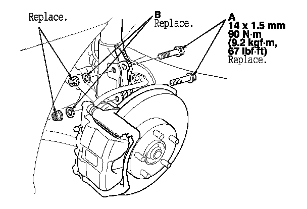 - Install the washers (B) included with the adjusting bolt set between the front damper and self-locking nut.