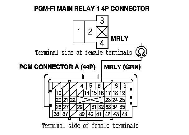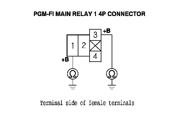 39. Check for continuity between body ground and PGM-FI main relay 1 4P connector terminals No. 1 and No. 3 individually.