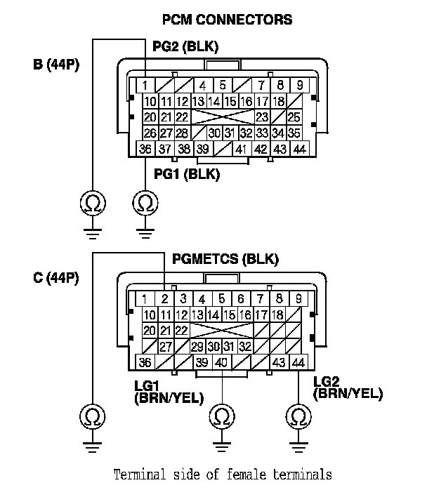 68. Check for continuity between body ground and PCM connector terminals B1, B36, C2, C40, and C44 individually.