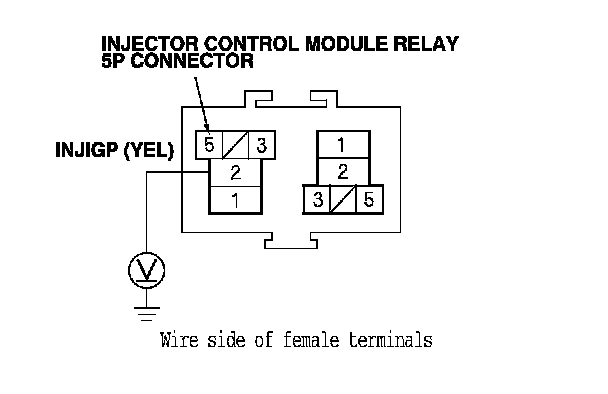 10. Measure the voltage between injector control module relay 5P connector terminal No. 5 and body ground.