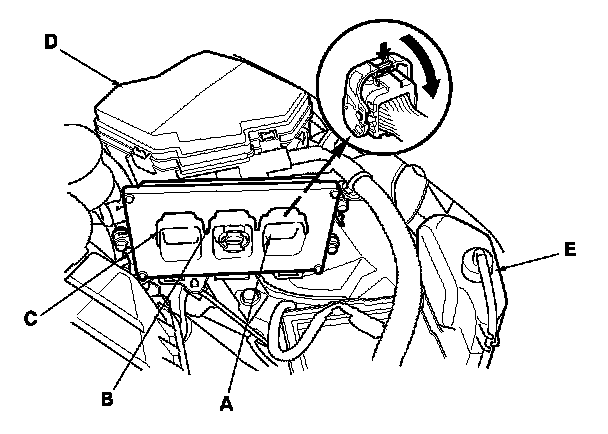 4. Remove the coolant reservoir (E). Disconnect PCM connectors A, B, and C.