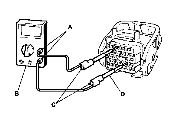6. Connect one side of the patch cord's terminals (A) to a commercially available digital multimeter (B), and connect the other side of the terminals (C) to a commercially available banana jack (Pomona Electronics Tool No. 3563 or equivalent) (D).