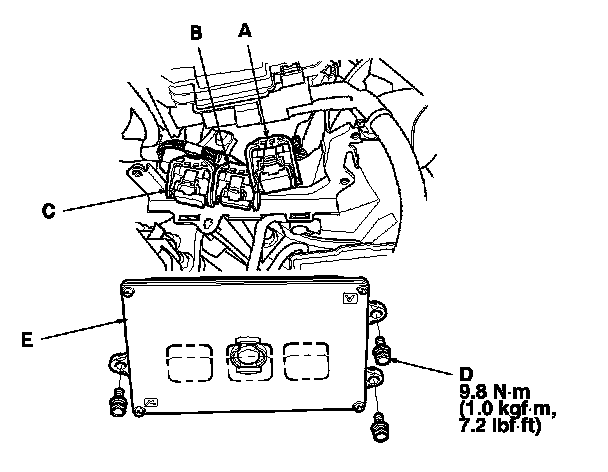 10. Remove the bolts (D), then remove the PCM (E).