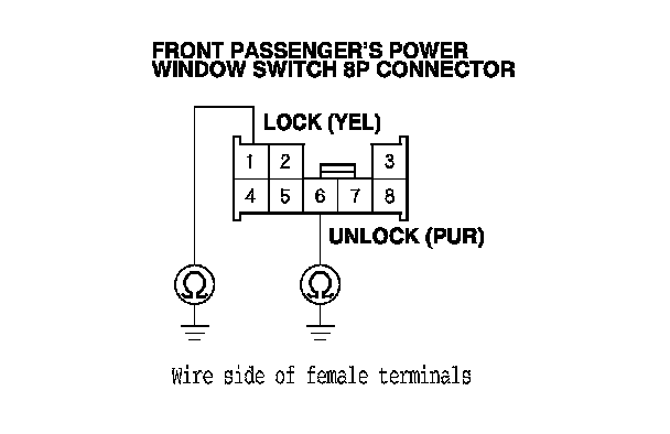 15. Check for continuity between front passenger's power window switch 8P connector terminals No. 1 (LOCK) and No. 6 (UNLOCK).