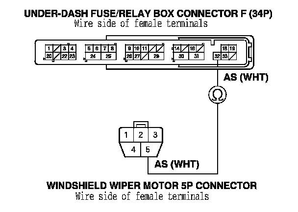 8. Check for continuity between windshield wiper motor 5P connector terminal No. 5 and under-dash fuse/relay box connector F (34P) terminal No. 32.