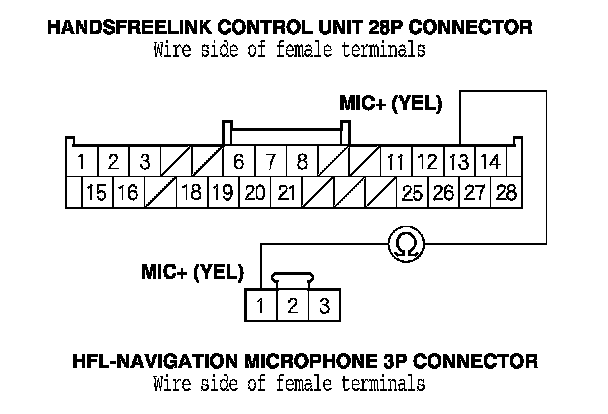 11. Check for continuity between HandsFreeLink control unit 28P connector terminal No. 13 and HFL-navigation microphone 3P connector terminal No. 1.