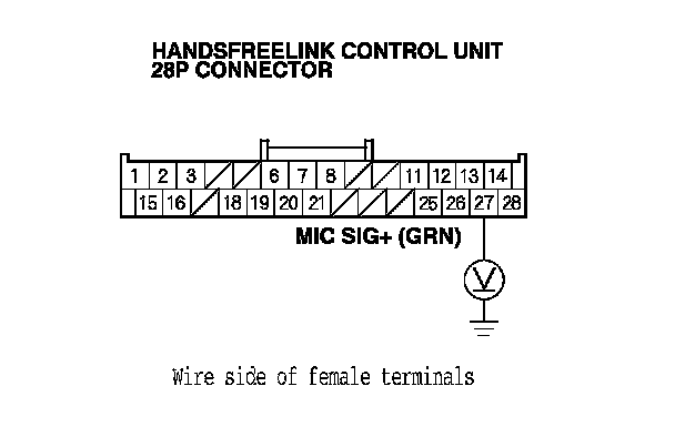 14. Measure the voltage between HandsFreeLink control unit 28P connector terminal No. 27 and body ground.