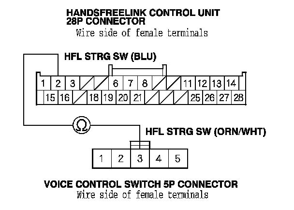 9. Check for continuity between HandsFreeLink control unit 28P connector terminal No. 2 and voice control switch 5P connector terminal No. 3.