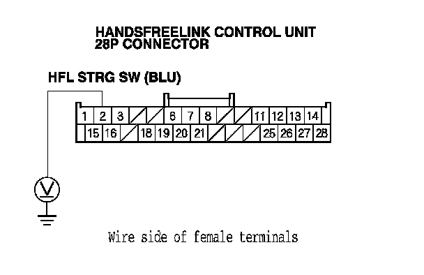 11. Measure the voltage between HandsFreeLink control unit 28P connector terminal No. 2 and body ground.