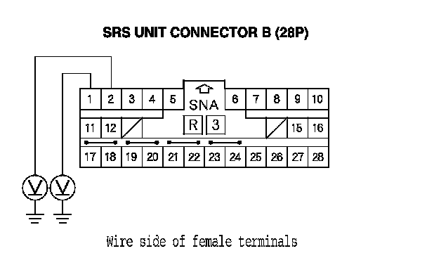 20. Measure the voltage between body ground and SRS unit connector B (28P) terminals No. 1 and No. 2 individually. There should be less than 0.2 V.