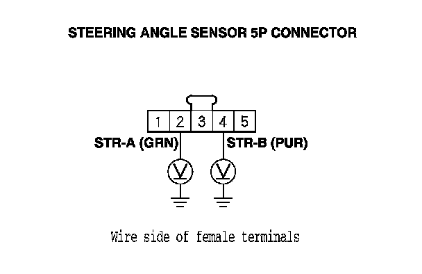 12. Measure the voltage between body ground and steering angle sensor 5P connector terminals No. 2 and No. 4 individually.