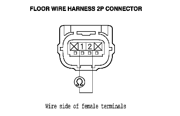 10. Measure the resistance between floor wire harness 2P connector terminals No. 1 and No. 2. There should be an open circuit or at least 1 MOhms.