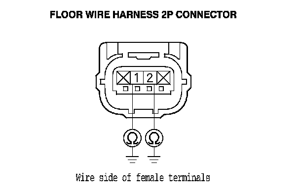 11. Measure the resistance between body ground and floor wire harness 2P connector terminals No. 1 and No. 2 individually. There should be an open circuit or at least 1 MOhms.