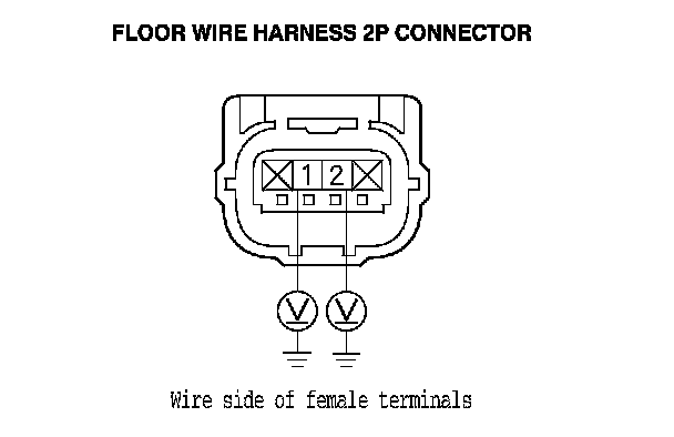 14. Measure the voltage between body ground and floor wire harness 2P connector terminals No. 1 and No. 2 individually. There should be less than 0.2 V.